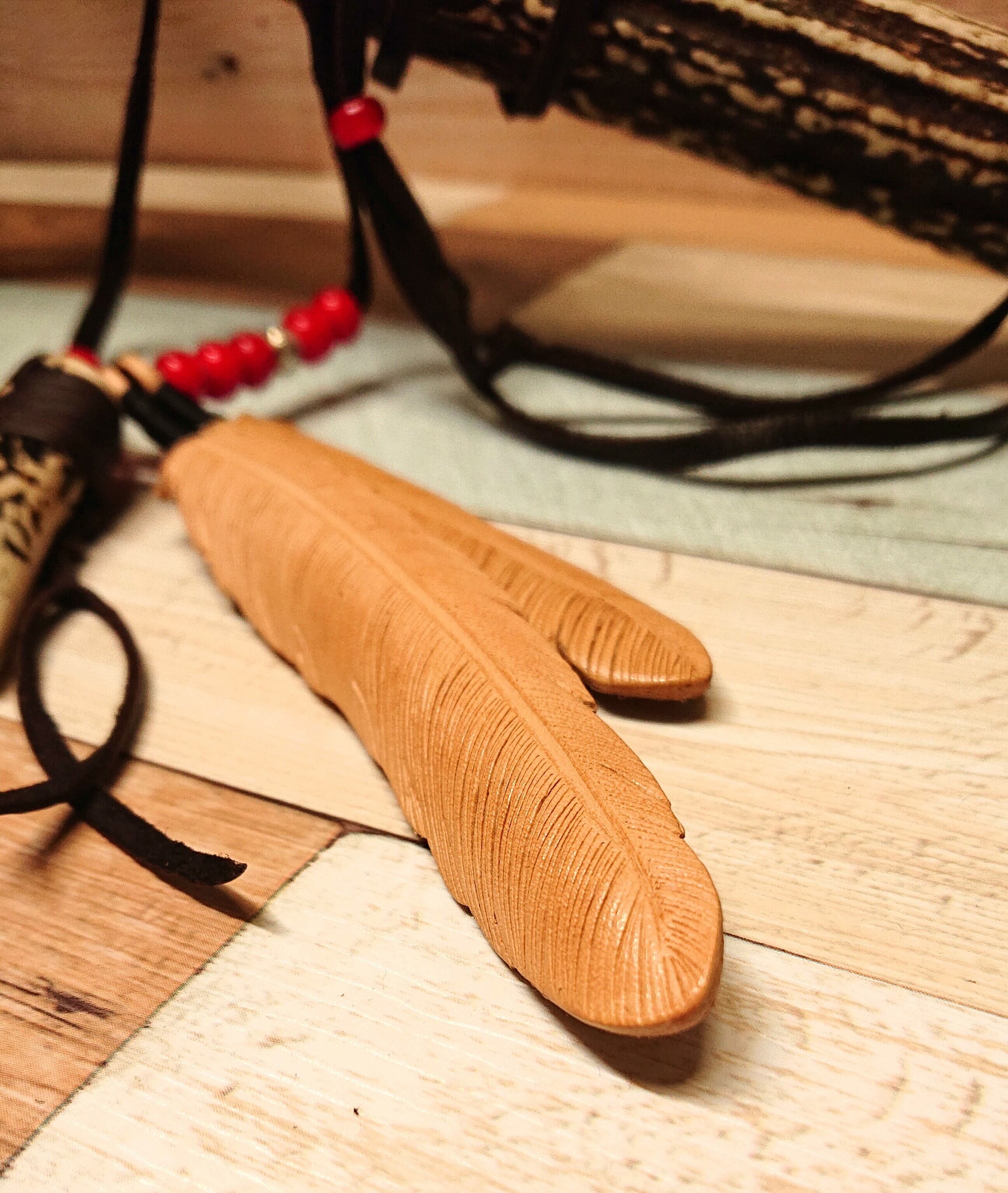 レザーにフェザーのカービングを