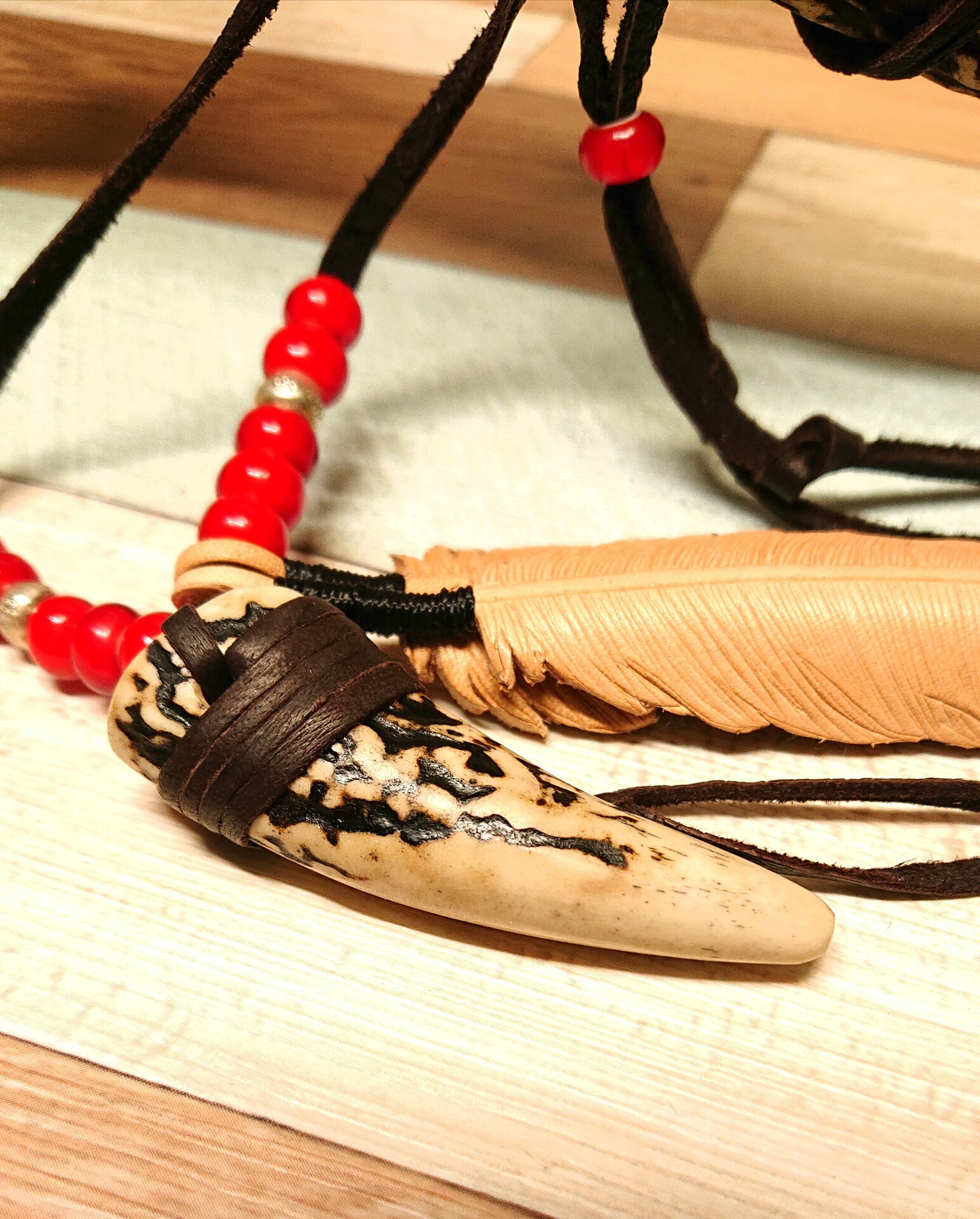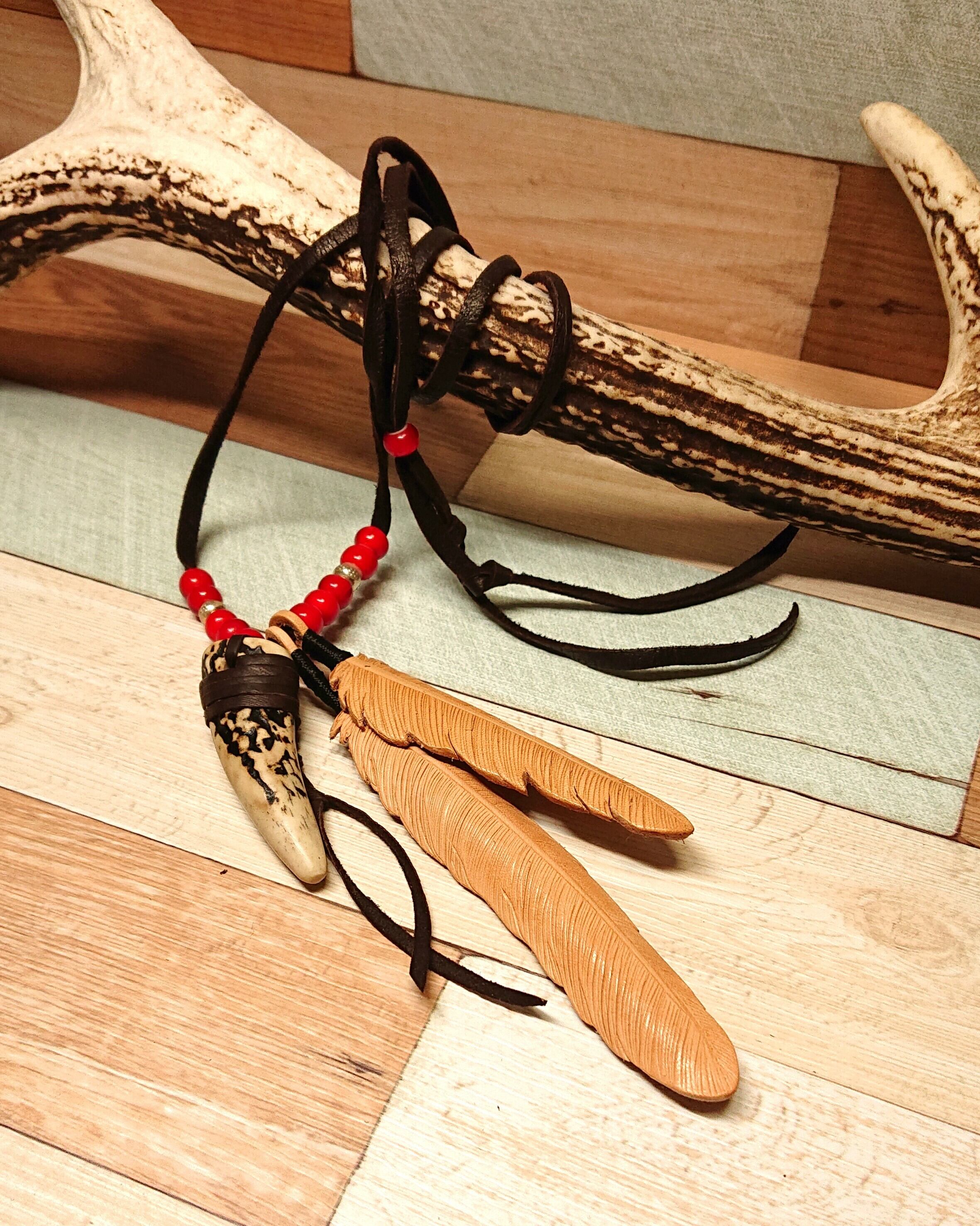 鹿角とレザーフェザーのネックレス