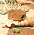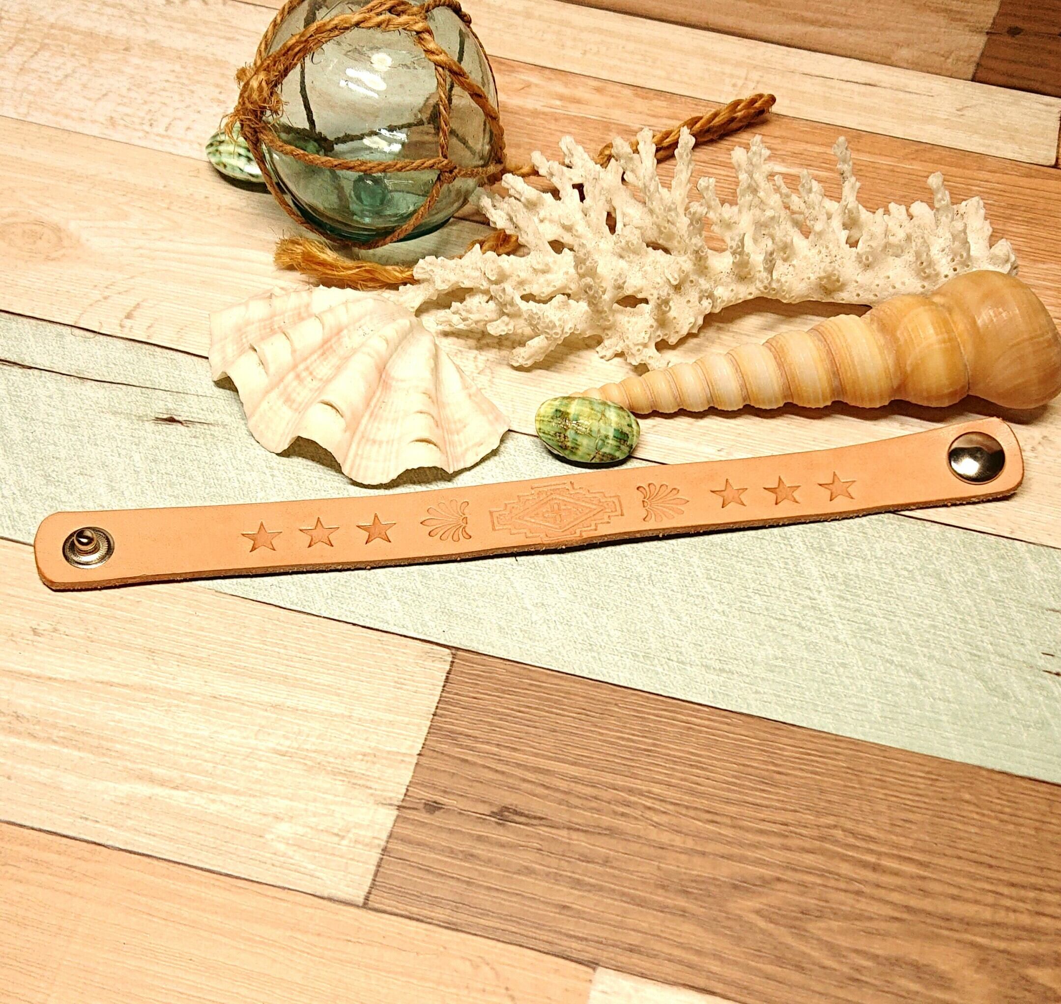 細目でシンプルな デザインで! 重ね着けるにも丁度良い オルテガ柄のブレスレットになります。 *サイズ* 手首~17㎝まで *革* 国産 ナチュラルカラー 約2㎜厚 幅18㎜