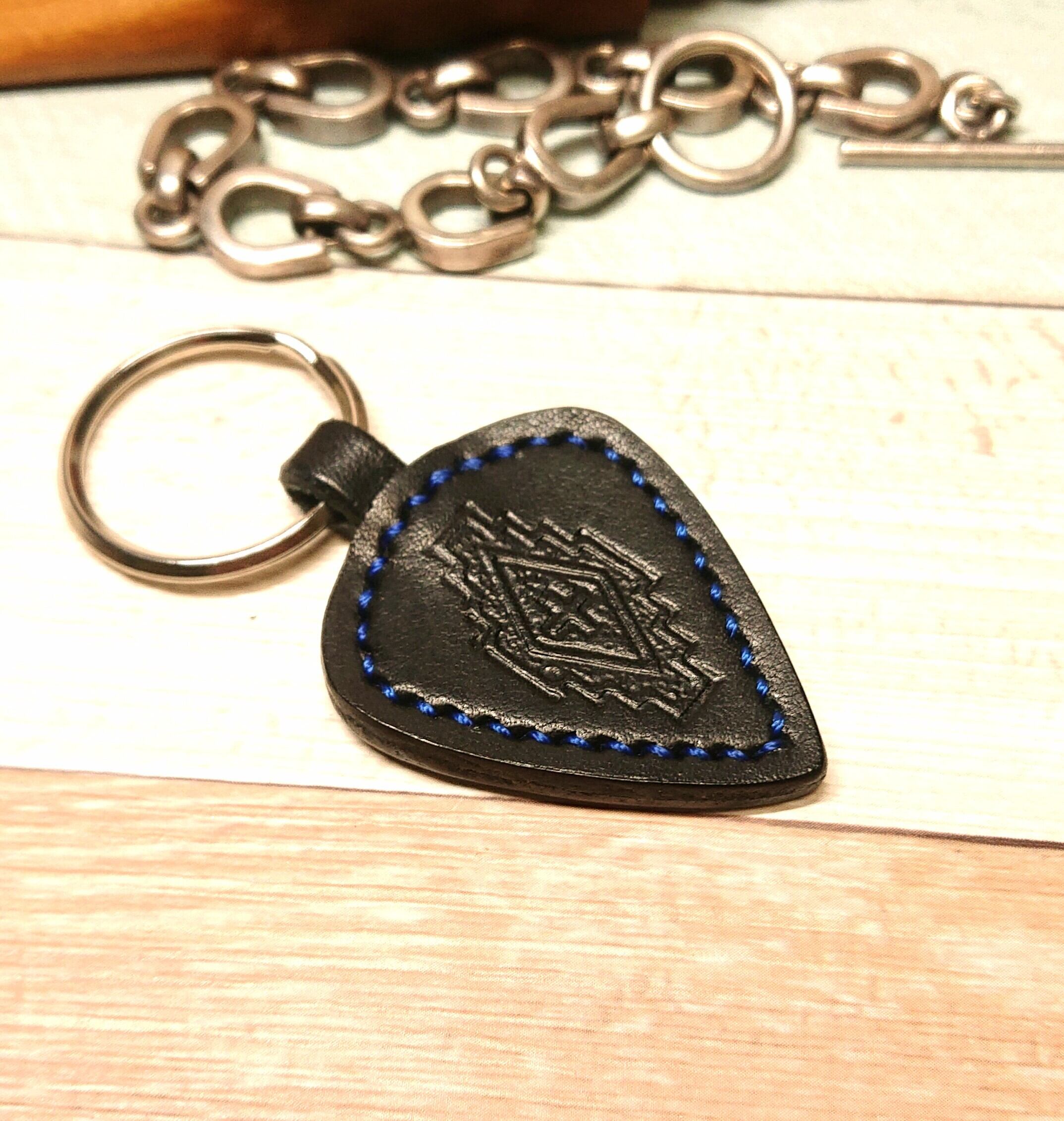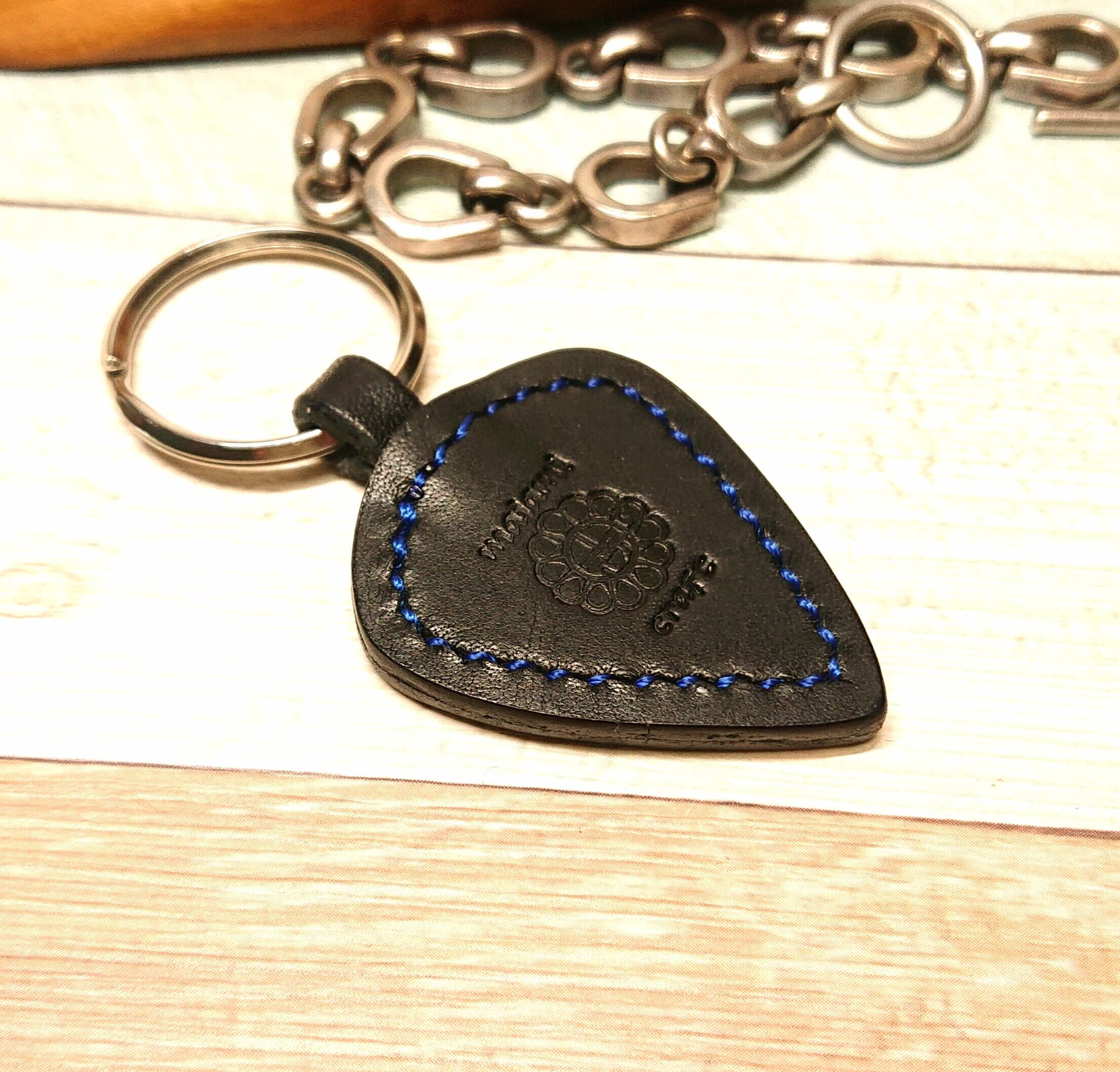ピック型のキーホルダー インディゴステッチ