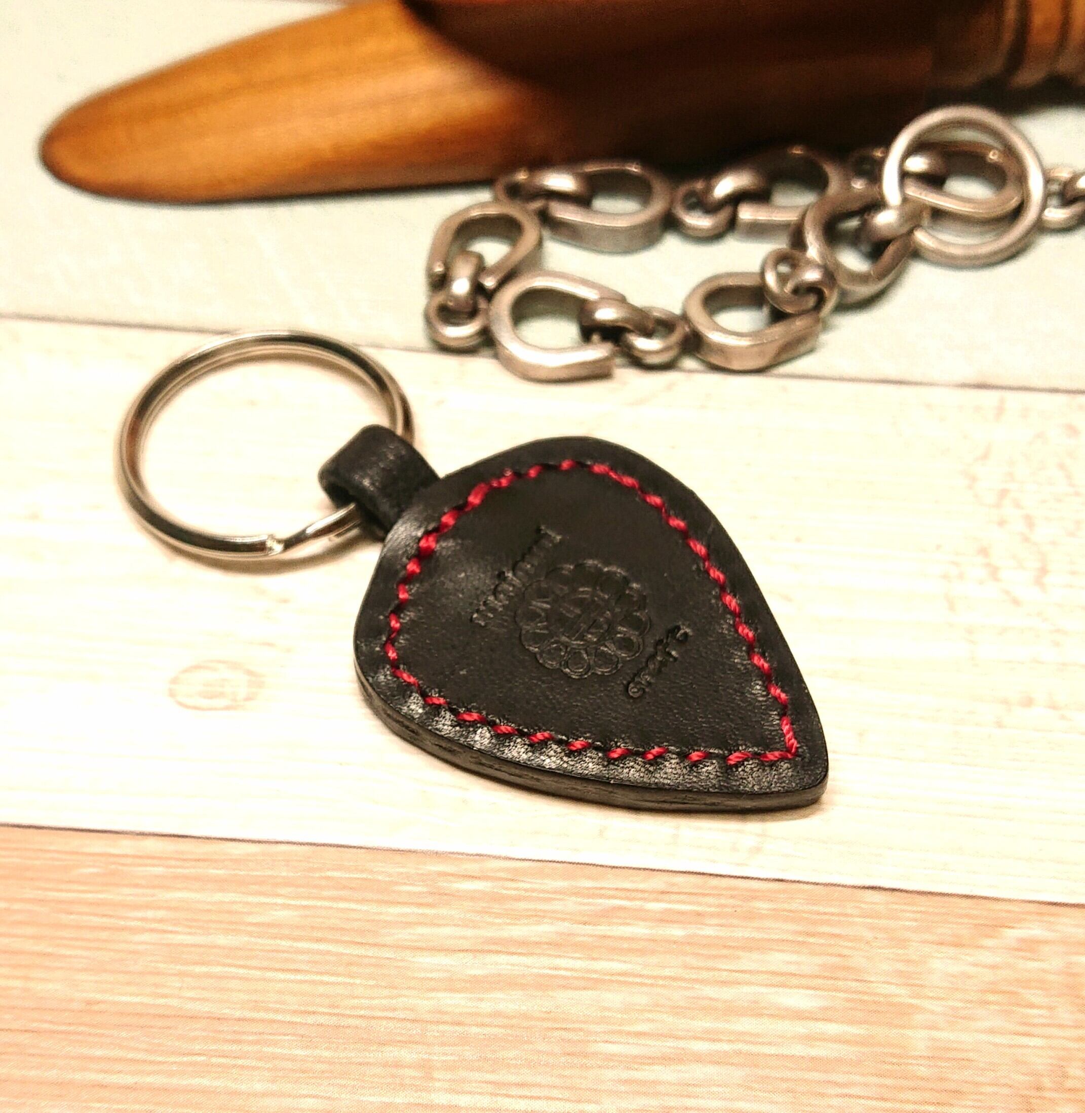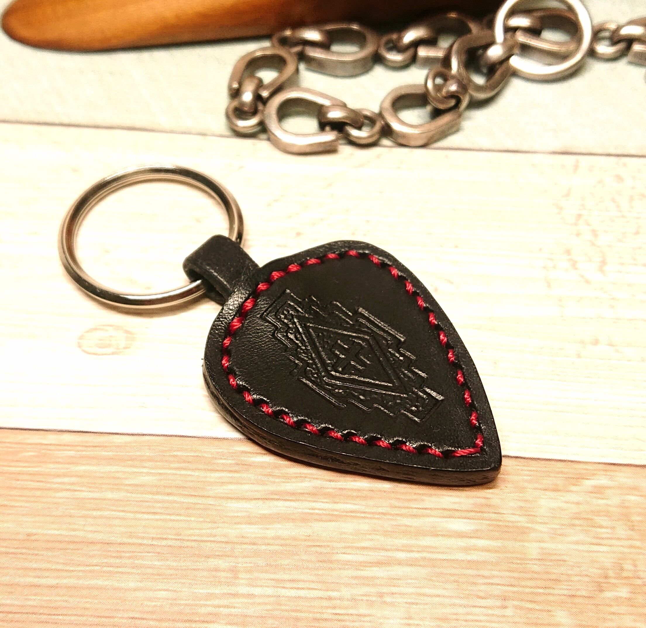 ピック型にカットした ブラックレザーに! オルテガ柄を刻印したキーホルダーになります。 *革* 国産 ブラック 2mm厚 *リング* 約3cm