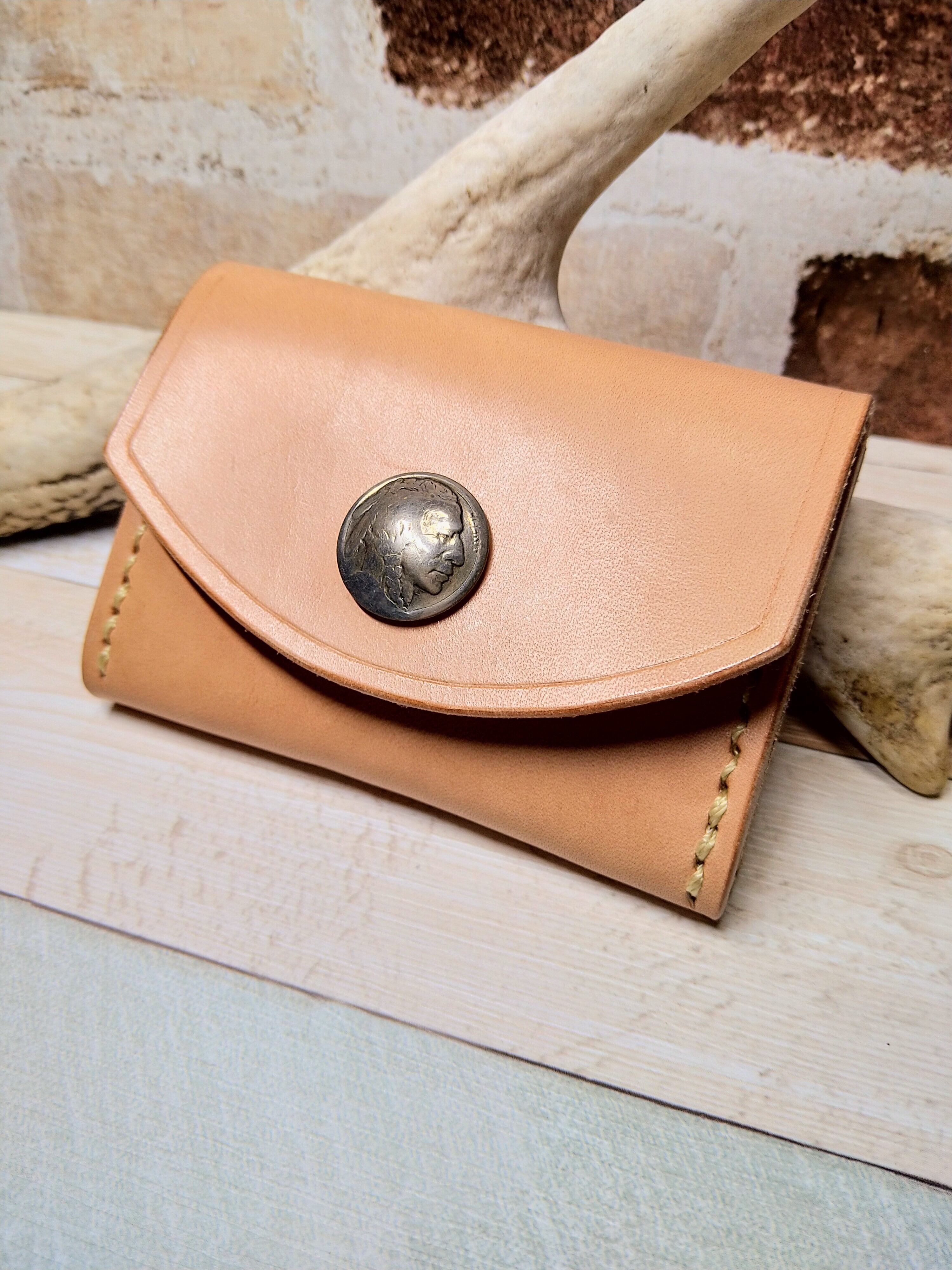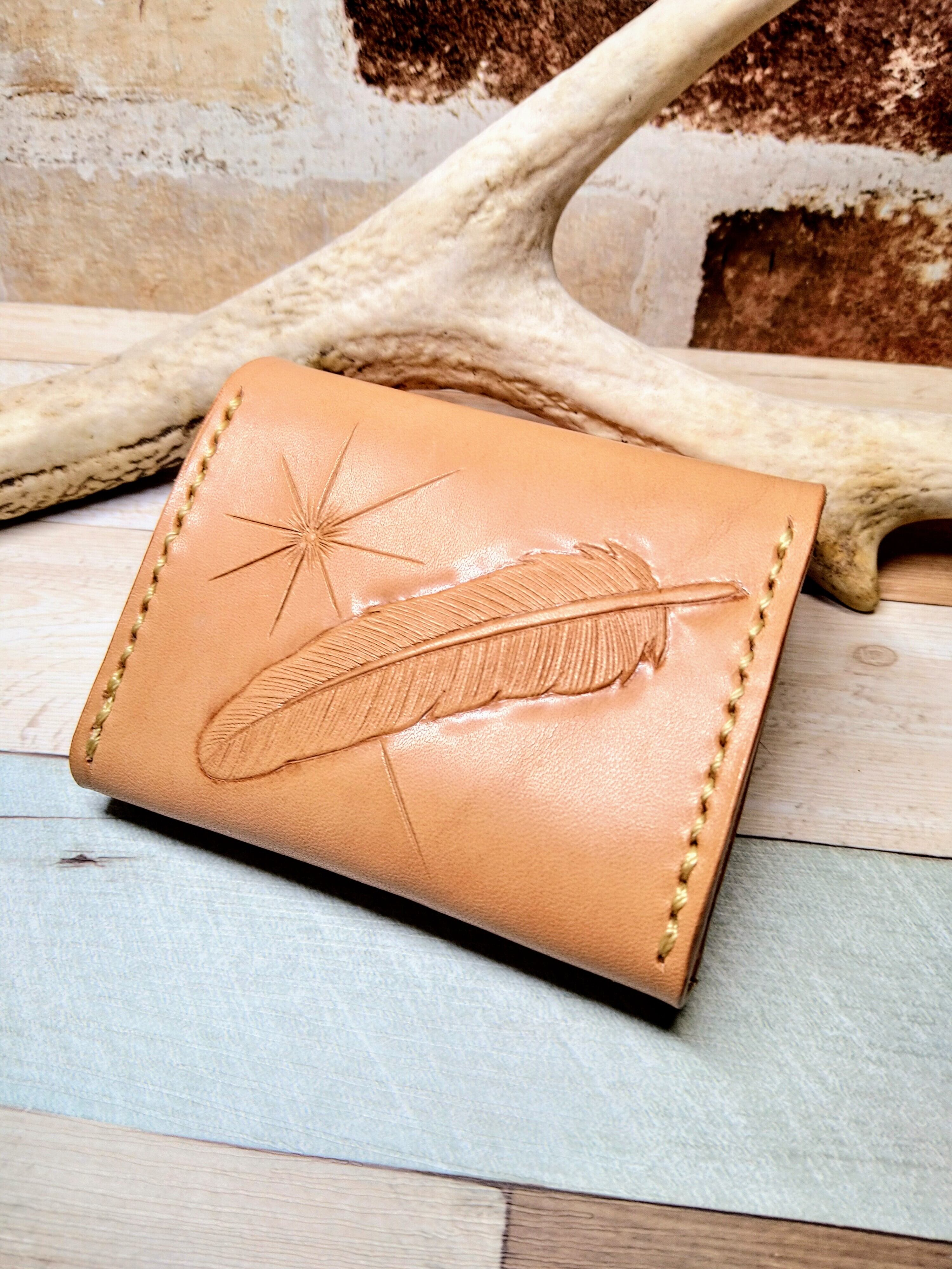革! 昭南ベンズ ナチュラル 2mmと1mmを使用 デザイン! 背面にフェザーと太陽神のカービング フリンジ無し スタンピング無し 内側にカードケース付き ボタン! コンチョ用のホール加工 受けのボタンの取り付け コンチョ無し ステッチ! ナチュラル